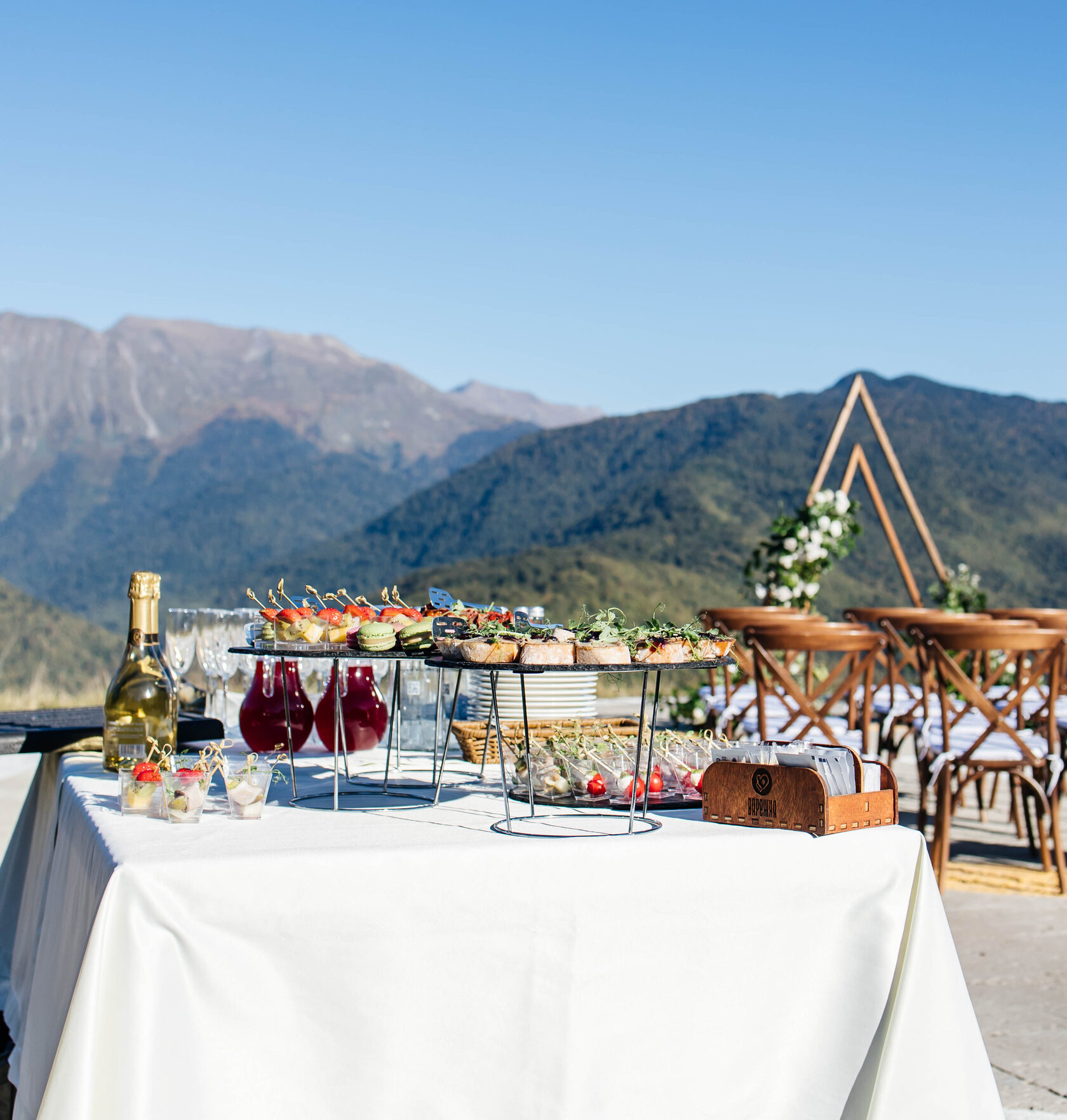 Ваша церемония пройдет максимально конфиденциально и камерно. При этом пейзаж, открывающийся с этой высоты поражает величием гор и красотой окружающей природы.